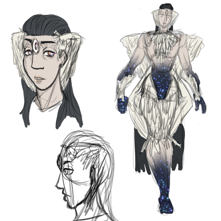 I tried adding shadowy figures behind him, as a sort of nod to his backstory. Originally I was going to draw his father as a shadow figure with his hand on Atlas's shoulder, but I didn't like how it looked/I couldn't just get it like how I wanted it. Plus, I didn't want to obscure the veils and clothes
