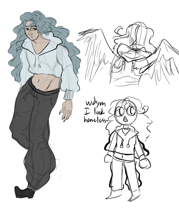 Appearance(s): mainly humanoid with large bat/dragon-like wings and a tail (think toothless from how to train your dragon), small pair of horns peak out of his short messy hair, he has 4 blue eyes with crescent moon pupils and very sharp teeth, his skin is dark and light blue, both shade distributed in patch across his body (vitiligo), usual clothes are moon and/or star theme, a tank top, long mittens, a pair of pants that’s probably been patched and sewn too many times, and boots. 1m50cm/4ft5inch